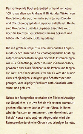 Dieses reich bebilderte Buch präsentiert das Leipziger Ballett, das in den letzten zehn Jahren unter Leitung von Chefchoreograph Uwe Scholz Triumphe feierte und heute weit über die Grenzen Deutschlands hinaus bekannt ist. Die Fotodokumentation zeigt die Inszenierungen von der "Schöpfung" über "Amerika" bis zu "Schwanensee", erlaubt Einblicke in die Proben und fängt den Glanz der Opernwelt in faszinierenden Bildern ein. Ein Muß für alle Ballettliebhaber.